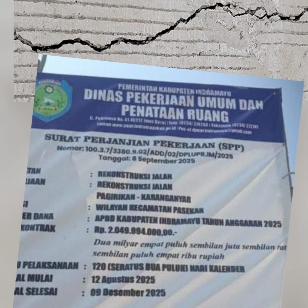 Pasalnya, proyek yang menelan anggaran senilai Rp.2.049.000.000 dari APBD Kabupaten Indramayu tahun 2025 melalui Dinas PUPR setempat, meski belum lama dibangun namun sudah muncul kerusakan seperti keretakan yang tidak wajar.