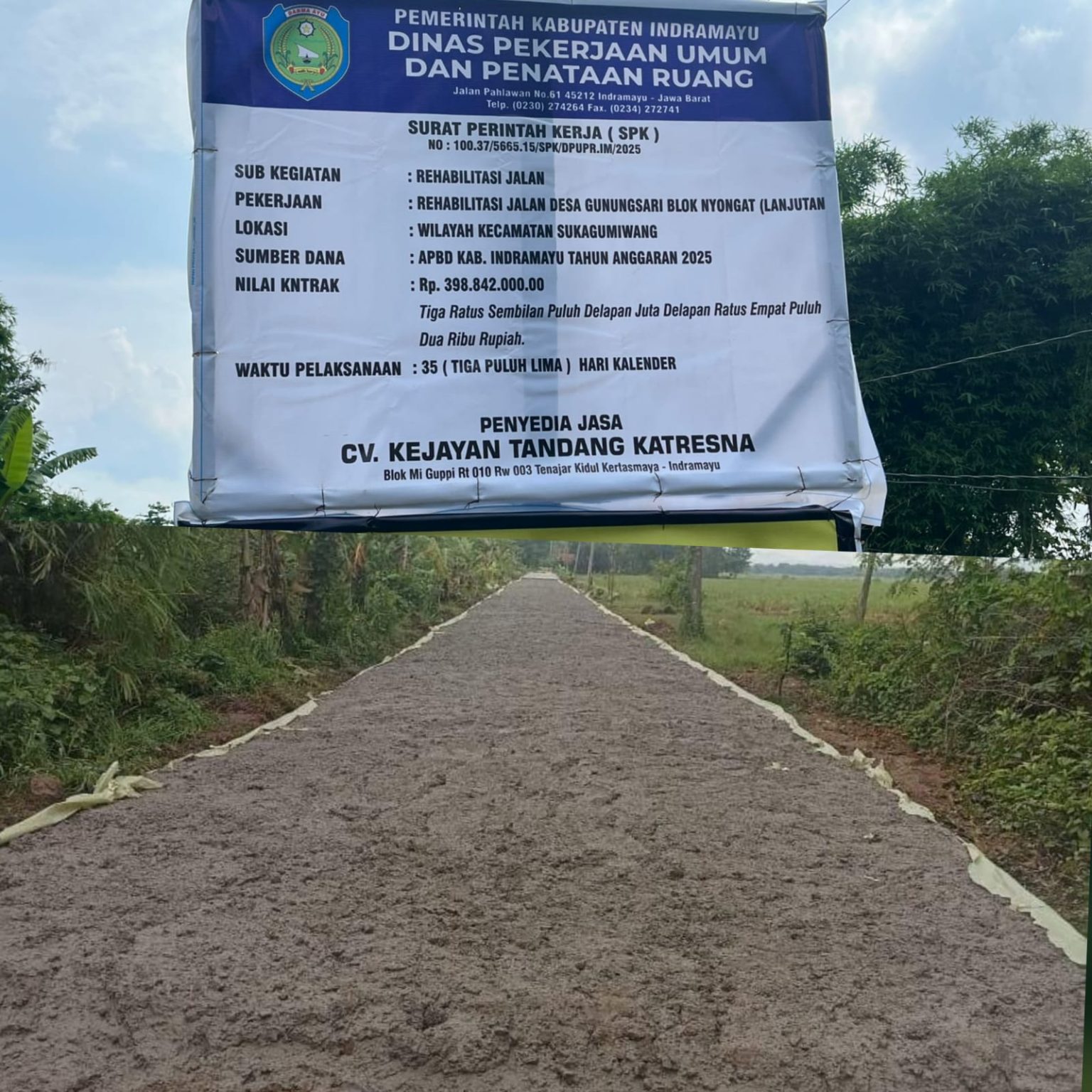 Diketahui, proyek yang saat ini dihujani sorotan publik tersebut didanai dari APBD Kabupaten Indramayu tahun anggaran 2025 melalui Dinas PUPR. Total biayanya bernilai Rp.398.842.000, dikerjakan oleh CV Kejayan Tandang Katresna dalam kurun waktu selama 35 hari kalender.